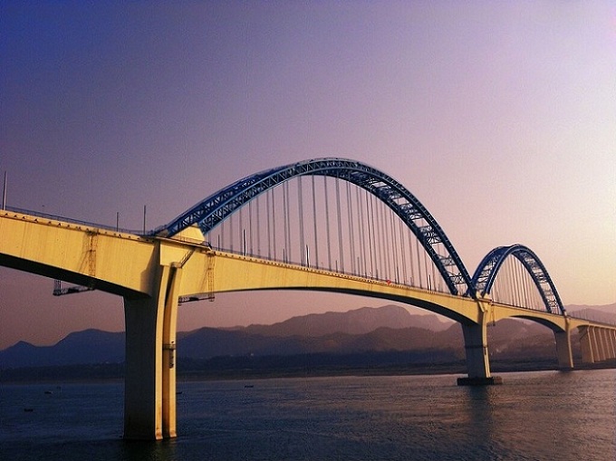 宜萬鐵路宜昌長江大橋位于宜昌港煙收壩水域,全長2527米,橋面設計為雙軌道,主梁連續(xù)剛構跨徑達275米,在同類型鐵路橋中位居全國第一。拱肋計算跨度264米,為目前國內鐵路最大跨度的鋼管混凝土拱。
