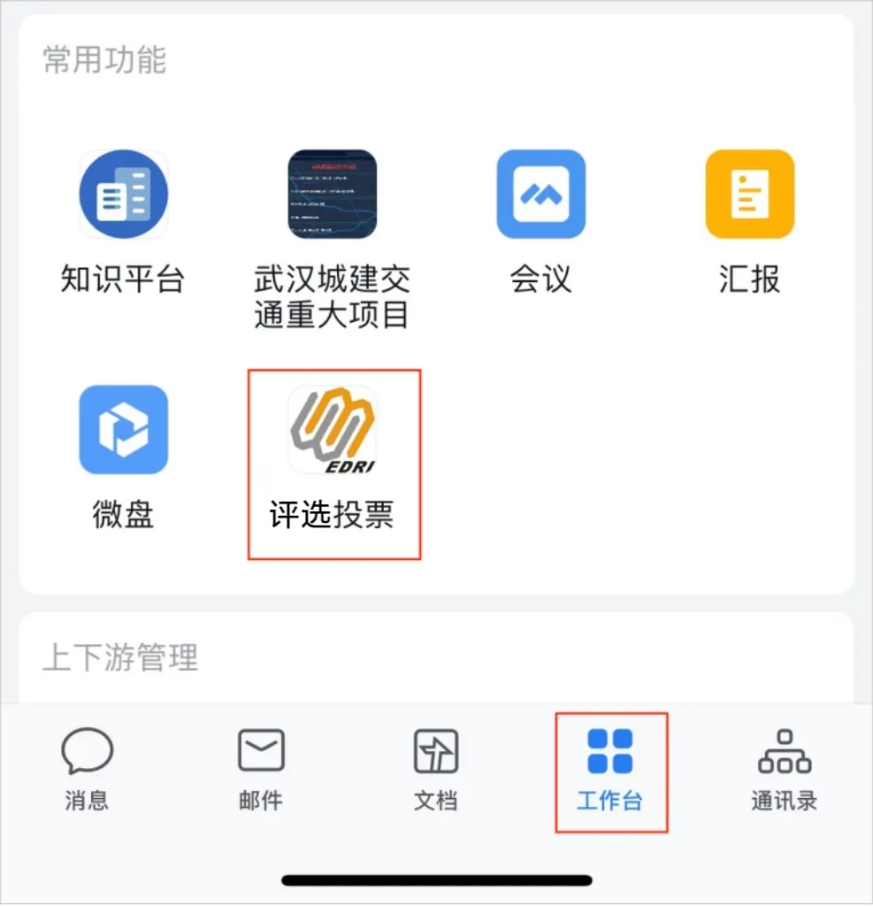手機(jī)端企業(yè)微信進(jìn)入工作臺,在常用功能一欄中打開“評選投票”小程序。