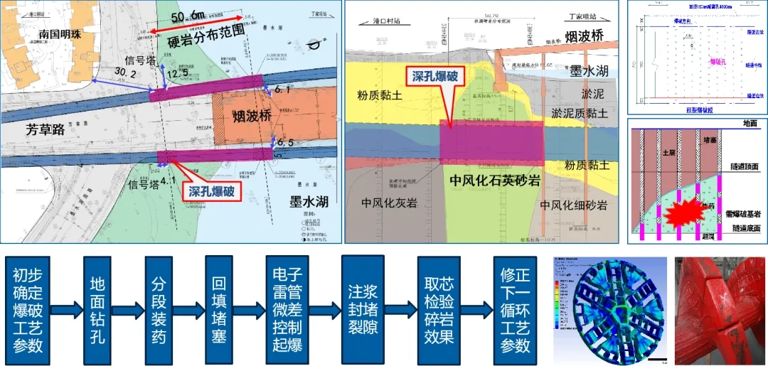 獲獎項目《地鐵隧道穿越極硬巖的新方法研究》是依托于武漢地鐵12號線港口村站至丁家咀站區(qū)間隧道工程。本項目存在隧道水下穿越強度高達251MPa極硬巖的復雜地質(zhì)和周邊有橋梁、建筑等敏感環(huán)境兩大難題,實驗團隊歷經(jīng)近兩年的方案研究和工程實踐,創(chuàng)新性地提出了解決方案:采用控制爆破技術對極硬巖進行預處理,有效降低盾構機掘進的難度,同時在爆破過程中采取相應的減隔震技術,保障周邊橋梁、房屋和市政管線等建構筑物的安全。這一新技術極大地降低盾構機掘進通過極硬巖的難度,提高了施工效率,大幅減少了工程成本,實現(xiàn)了良好的社會和經(jīng)濟效益。