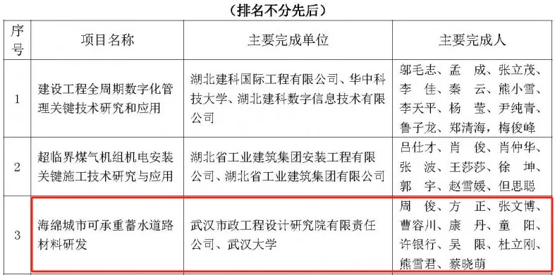 近日,湖北省土木建筑學(xué)會公布第五屆湖北省土木建筑科學(xué)技術(shù)獎獲獎名單,由武漢市政院牽頭、武漢大學(xué)共同參與的《海綿城市可承重蓄水道路材料研發(fā)》科研項(xiàng)目榮獲二等獎。