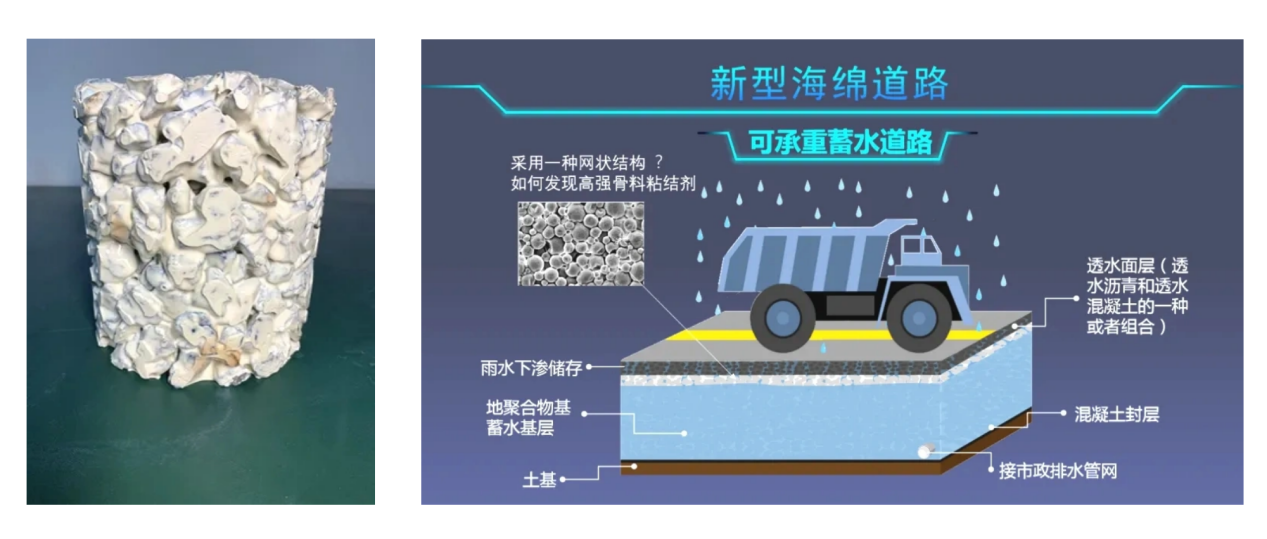 本次獲獎的《海綿城市可承重蓄水道路材料研發(fā)》科研項(xiàng)目打破了傳統(tǒng)的要求道路基層嚴(yán)格防水的固有思維局限,首次且極具創(chuàng)造性地提出了利用高空隙率的道路基層作為蓄水空間的可承重蓄水道路的新理念。依照這種新的理念,項(xiàng)目團(tuán)隊制定了嶄新的研究思路并成功開發(fā)出了一種具有高強(qiáng)度、高粘結(jié)特性的新型地聚合物凝膠材料,利用該凝膠材料包覆開級配骨料表面能夠?qū)⒋止橇侠喂痰卣辰Y(jié)在一起,可形成具備高強(qiáng)度和高空隙率的蜂窩狀空間結(jié)構(gòu)凝聚體路基材料,從而能夠在保證路基結(jié)構(gòu)整體強(qiáng)度的同時,實(shí)現(xiàn)高效的道路基層蓄水功能,有利于緩解城市內(nèi)澇,達(dá)到海綿城市可承重蓄水道路建設(shè)的要求,同時也為大幅提升城市地下空間有效利用率提供了新的可能性。在該項(xiàng)目開展成果評價時,評價專家委員會也一致認(rèn)為項(xiàng)目研究成果達(dá)到了國內(nèi)領(lǐng)先水平。