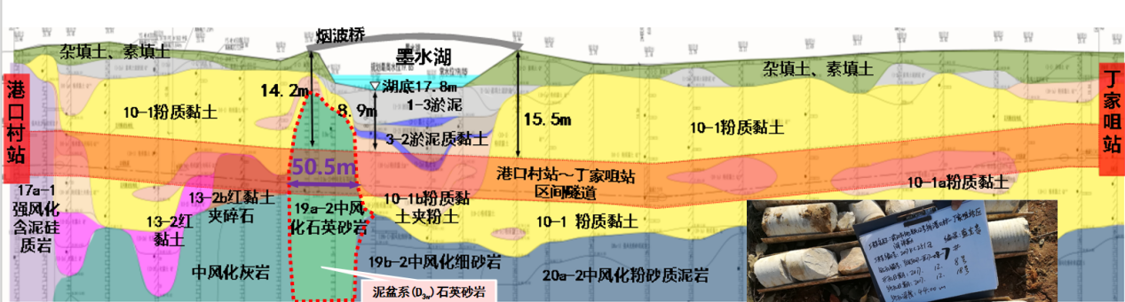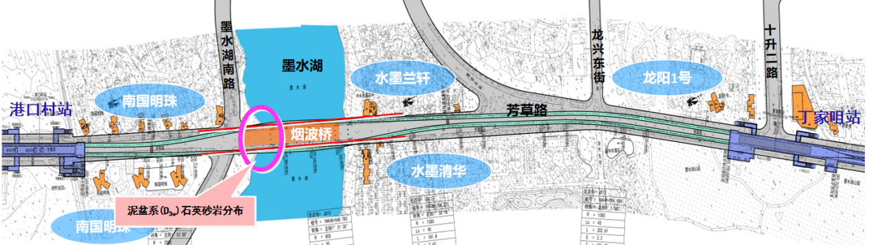 ? ? 超硬巖層、超近下穿。本項目設計范圍中的港口村站~丁家咀站區(qū)間隧道長約1242m,采用盾構(gòu)法施工,管片直徑6.2m,需下穿墨水湖與煙波橋,該巖層號稱“磨刀石”,為武漢地鐵建設史上的最硬巖層。