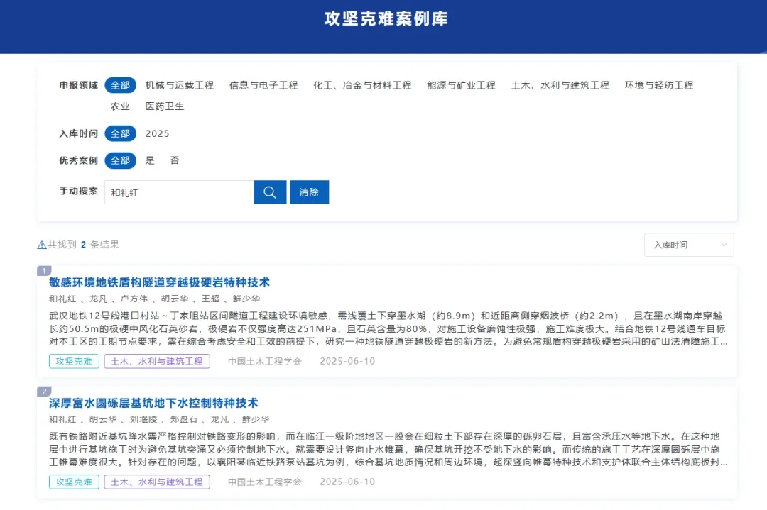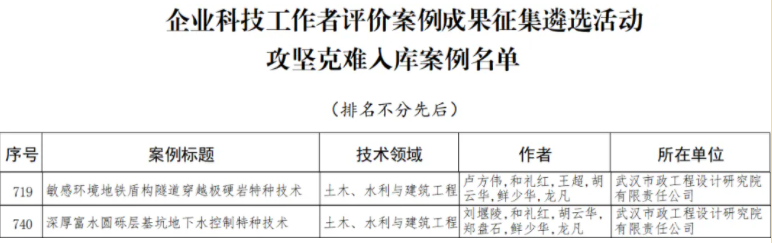 ? ? ?2025年6月4日,中國科協發(fā)布了《關于企業(yè)科技工作者評價案例成果征集遴選活動結果的通知》,公布了《企業(yè)科技工作者評價案例庫》,其中攻堅克難案例843項、成果轉化案例726項。武漢市政院巖土博士創(chuàng)新工作室申報的“敏感環(huán)境地鐵盾構隧道穿越極硬巖特種技術”、“深厚富水圓礫層基坑地下水控制特種技術”兩項攻堅克難案例與技術均成功入庫。