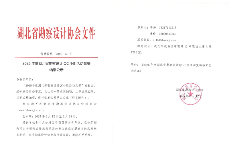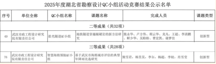 武漢市政院再傳捷報!近日,湖北省勘察設(shè)計協(xié)會組織召開的“2025 年度湖北省勘察設(shè)計QC小組活動競賽”中,武漢市政院選送的兩個QC小組表現(xiàn)亮眼:地空事業(yè)部"拾光隧道QC小組"憑借創(chuàng)新成果斬獲競賽二等獎,規(guī)劃研究事業(yè)部"智慧海綿領(lǐng)航QC小組"榮獲三等獎佳績。