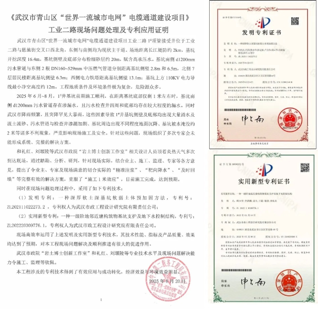 發(fā)明專利“一種深厚軟土深基坑軟弱土體預加固方法”(專利號:ZL202111022273.2)與實用新型專利“一種一級階地鄰近建構筑物基坑支護及地下水控制結構”(專利號:ZL202220309776.1),在武漢市青山區(qū)“世界一流城市電網(wǎng)”電纜通道建設項目——工業(yè)二路現(xiàn)場問題處理中實現(xiàn)了高效應用。兩項專利的技術性能、實施效果及產(chǎn)品質量均達到預期目標,成功完成了技術轉化,展現(xiàn)出良好的經(jīng)濟效益與環(huán)境效益。