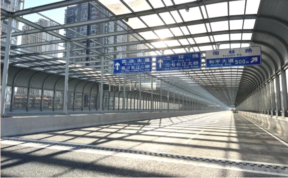 ? ? 項(xiàng)目設(shè)計(jì)團(tuán)隊(duì)始終秉持 “輕量化、智能化、綠色化” 理念,多項(xiàng)技術(shù)應(yīng)用填補(bǔ)區(qū)域空白,樹立行業(yè)新標(biāo)桿。在鋪裝材料與工藝上,主線高架鋼箱梁橋面采用澆注式瀝青鋪裝,相比傳統(tǒng)方案減重16%,既降低橋梁結(jié)構(gòu)負(fù)荷、提升安全性,又縮短施工周期;鋼箱梁采用U肋全熔透智能焊接,大幅提高結(jié)構(gòu)疲勞壽命,積極推進(jìn)鋼箱梁U肋焊接工藝的發(fā)展。尤為引人注目的是,本項(xiàng)目集中展現(xiàn)了三大創(chuàng)新亮點(diǎn):它擁有全國(guó)最長(zhǎng)的連續(xù)全封閉聲屏障,是湖北省首例“光伏+市政”的融合實(shí)踐,更在武漢率先實(shí)現(xiàn)了聲屏障光伏發(fā)電的應(yīng)用,為綠色市政建設(shè)樹立了新的樣板。