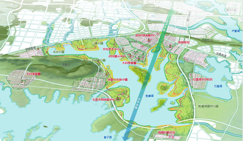 ? ? 豹澥湖位于武漢新城的山水景觀主軸,是武漢新城構(gòu)建“看山望水、疏朗通透”景觀視廊體系的重要節(jié)點(diǎn),也是武鄂黃黃核心區(qū)南部湖區(qū)生態(tài)空間的重要組成部分,是大江大湖群山富集之地,流域的系統(tǒng)化治理也是推動(dòng)武鄂黃黃一體化建設(shè)的關(guān)鍵性實(shí)踐。以科學(xué)島為核心的環(huán)豹澥湖科創(chuàng)圈已初具規(guī)模,豹澥湖流域?qū)⑹俏錆h新城區(qū)域內(nèi)未來(lái)最具發(fā)展?jié)摿Φ暮诵膮^(qū)。
