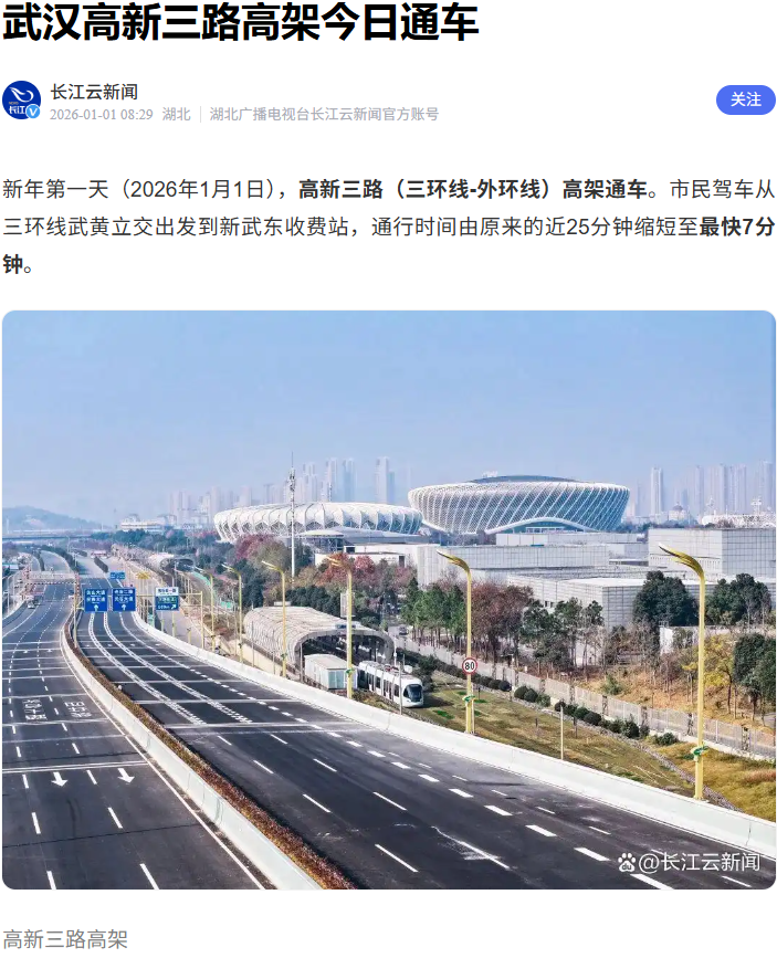 2026年1月1日,由武漢市政院參與設(shè)計(jì)的高新三路(三環(huán)線~外環(huán)線)改造提升工程主線高架通車!這條西起三環(huán)線武黃立交、東至新武東收費(fèi)站,總長(zhǎng)10.7公里(其中主線高架8.23公里)的交通大動(dòng)脈,以“主線高架+地面輔道”的立體格局,打通了光谷東向通行瓶頸,也承載著武漢市政院在綠色建造領(lǐng)域的技術(shù)突破,為武漢智慧交通建設(shè)樹立了新標(biāo)桿。