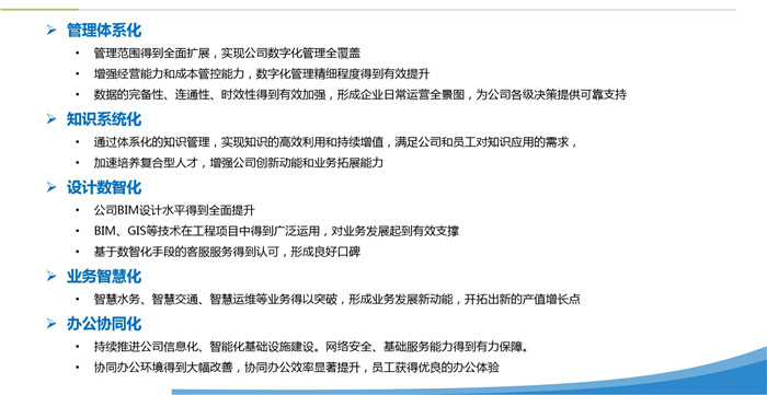 信息中心對(duì)《公司2021-2023年數(shù)字化建設(shè)發(fā)展綱要》進(jìn)行了宣貫。近年來,公司緊跟行業(yè)發(fā)展形勢,立足公司實(shí)際需要,開展了以日常運(yùn)營、項(xiàng)目管理、智慧平臺(tái)、移動(dòng)辦公等為主要內(nèi)容的數(shù)字化建設(shè)工作,取得了積極成效?!毒V要》立足當(dāng)前公司數(shù)字化發(fā)展需求,提出了管理體系化、知識(shí)系統(tǒng)化、設(shè)計(jì)數(shù)智化、業(yè)務(wù)智慧化、辦公協(xié)同化五個(gè)方面的發(fā)展目標(biāo),明確了各方面的建設(shè)內(nèi)容及相關(guān)組織保障。