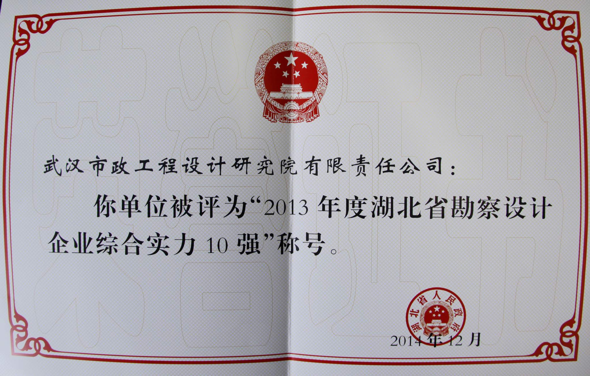 ??? 2月12日,湖北省住房城鄉(xiāng)建設(shè)工作會議暨黨風(fēng)廉政建設(shè)工作會議在洪山禮堂召開,會議正式下發(fā)文件,對2013年度湖北省勘察設(shè)計(jì)企業(yè)綜合實(shí)力十強(qiáng)進(jìn)行表彰,公司憑借近年來在行業(yè)中的突出表現(xiàn)而榜上有名。