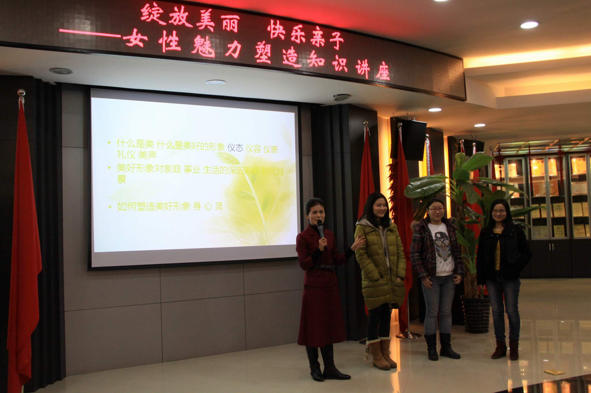 ??? 隨后,盧紅梅女士及她的團隊為大家送上了精彩的“女性魅力大餐”,從女性的“身、心、靈”等幾個方面詮釋了如何提高女性魅力。講座現(xiàn)場,公司三位女員工被授課老師現(xiàn)重新打造后,現(xiàn)場換裝,煥發(fā)了不一樣的女性魅力。