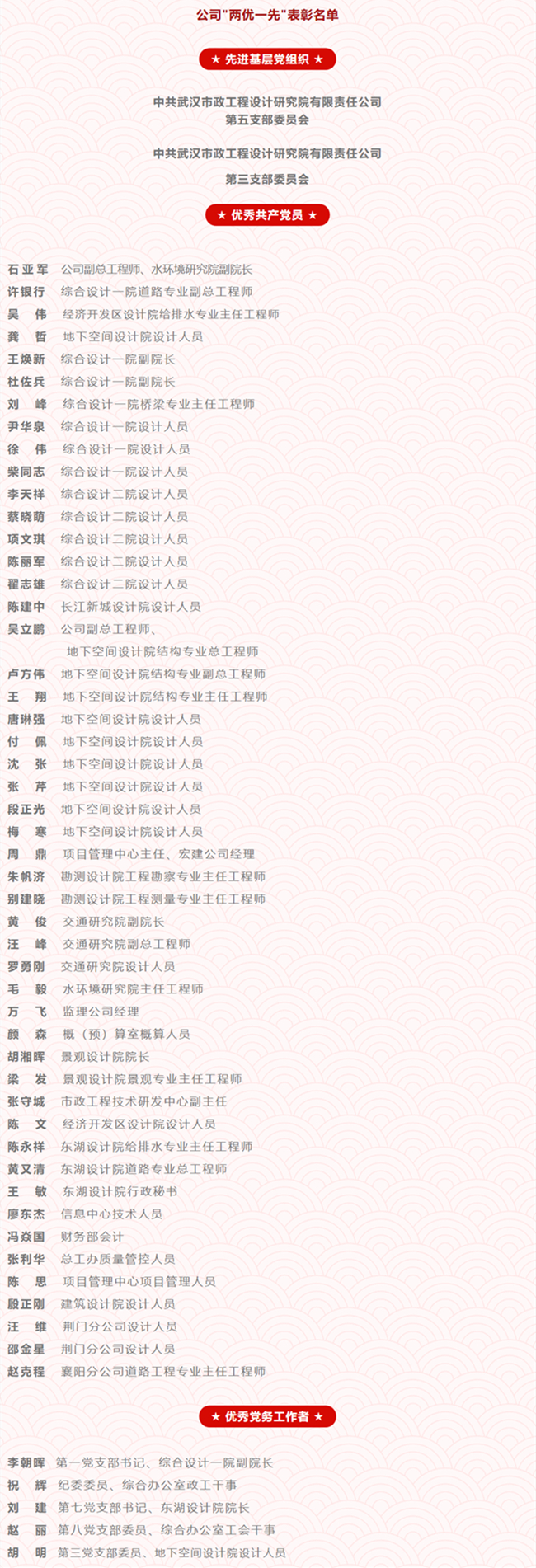 公司綜合設(shè)計一院道路專業(yè)副總工程師許銀行、經(jīng)濟(jì)開發(fā)區(qū)設(shè)計院給排水專業(yè)主任工程師吳偉、地下空間設(shè)計院設(shè)計人員龔哲榮獲市城投集團(tuán)公司“優(yōu)秀共產(chǎn)黨員”稱號;