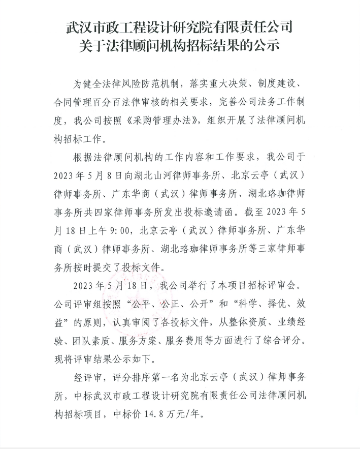 武漢市政工程設計研究院有限責任公司關于法律顧問機構招標結果的公示